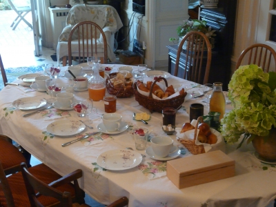 Le petit déjeuner est servi au rez de chaussée dans une pièce donnant sur le jardin ou sur la terrasse quand la météo le permet.